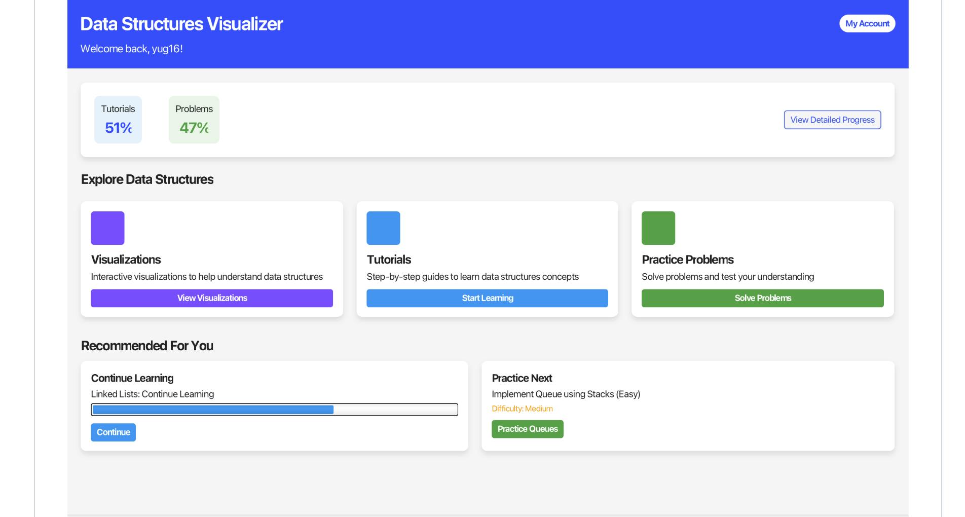 - 🎞️ Visualizations: Step-by-step animations of arrays, linked lists, stacks, queues, trees & graphs