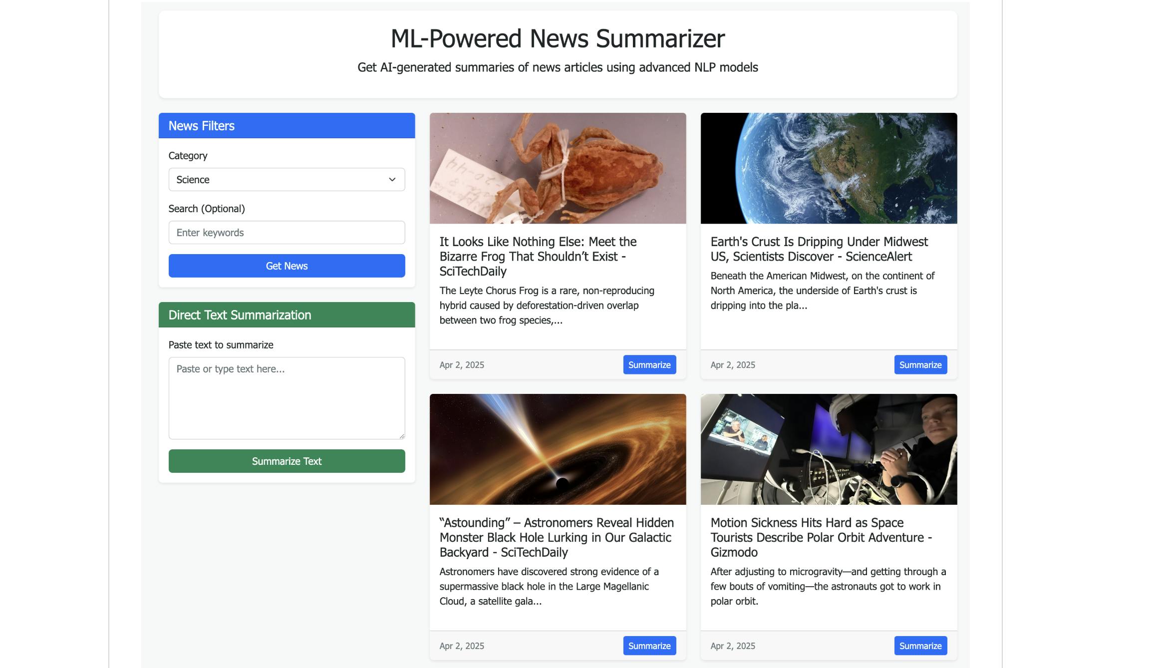 A modern web app that fetches real-time news from NewsAPI and generates AI-powered summaries using Google's T5 transformer model via HuggingFace.